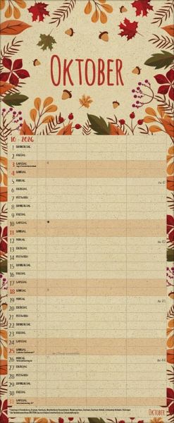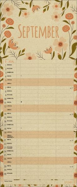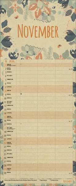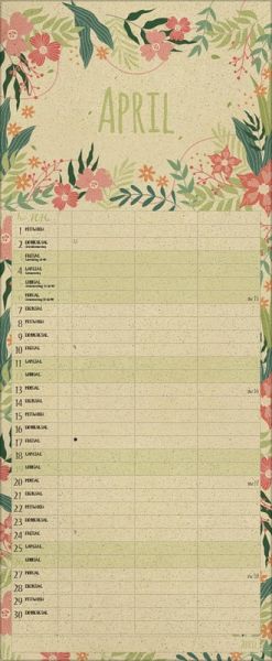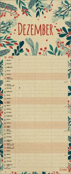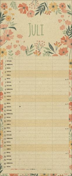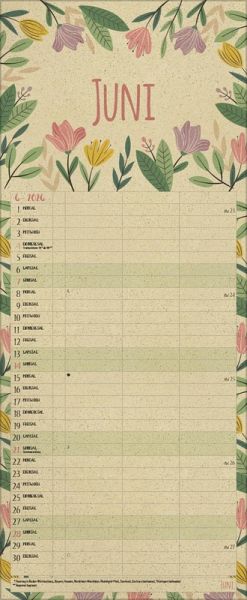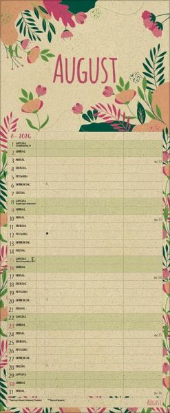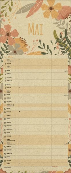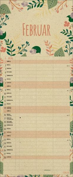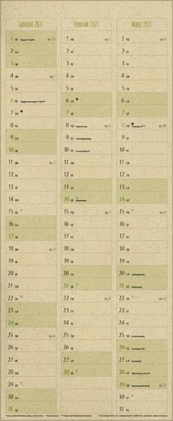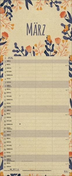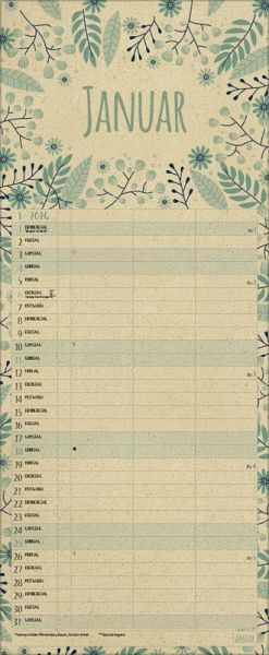 Übersichtlicher Familienplaner mit 3 Spalten; sehr stabile Rückwand; 19 x 46 cm Praktische Zusatzspalte für Ferien, Müll und weitere AktivitätenTerminkalender mit viel Platz für Eintragungen, ohne störende Bilder in den Spalten leichte Beschreibbarkeit, auch mit Bunt- und Bleistiften Deutsches Kalendarium mit regionalen Feiertagen für Deutschland, Österreich und Schweiz Farblich hervorgehobene Sonn- und Feiertage, sowie Anzeige der Zeitumstellung Gedruckt auf dickem und umweltfreundlichem Grasfaserpapier