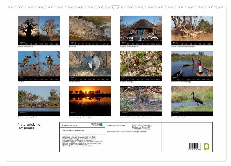 QUALITÄT - Hochwertiger Fotokalender mit 12 wunderschönen Motiven auf lichtbeständigem Bilderdruckpapier, robuste Spiralbindung mit Aufhängebügel.NACHHALTIG - deutliche Abfallreduzierung durch bedarfsgerechte Einzelstückfertigung, umweltfreundliches FSC-zertifiziertes Papier, Produktion in Deutschland, klimabewusste Logistik.PERFEKTES GESCHENK - Kalender für Freunde und Familie, für Kinder und Erwachsene, jung und alt, zu Weihnachten, Geburtstag oder zwischendurch.VIELFALT - Bildkalender in verschiedenen Formaten, z.B. DIN A5, DIN A4, DIN A3 sowie DIN A2. Ob Naturmotiv, Gemälde oder Fotos, ideal für ein persönliches Wohlfühlambiente.Eindrücke aus dem Chobe Park und dem Okavango Delta von Autor(in): Willy Brüchle