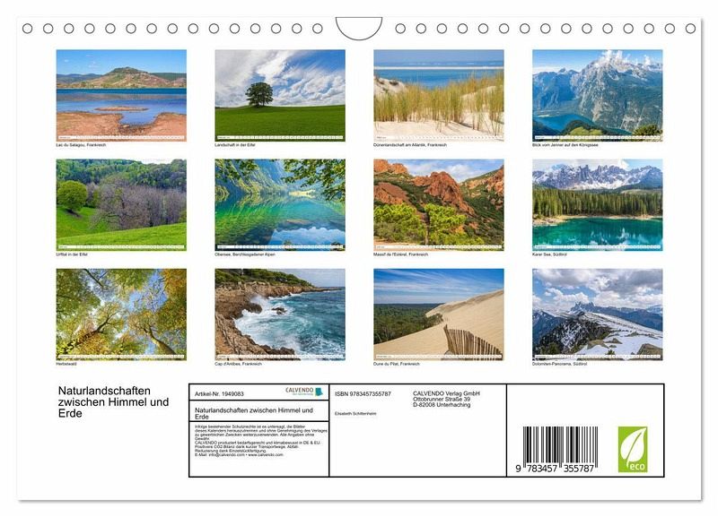 QUALITÄT - Hochwertiger Fotokalender mit 12 wunderschönen Motiven auf lichtbeständigem Bilderdruckpapier, robuste Spiralbindung mit Aufhängebügel.NACHHALTIG - deutliche Abfallreduzierung durch bedarfsgerechte Einzelstückfertigung, umweltfreundliches FSC-zertifiziertes Papier, Produktion in Deutschland, klimabewusste Logistik.PERFEKTES GESCHENK - Kalender für Freunde und Familie, für Kinder und Erwachsene, jung und alt, zu Weihnachten, Geburtstag oder zwischendurch.VIELFALT - Bildkalender in verschiedenen Formaten, z.B. DIN A5, DIN A4, DIN A3 sowie DIN A2. Ob Naturmotiv, Gemälde oder Fotos, ideal für ein persönliches Wohlfühlambiente.Landschaften, die von der Natur erschaffen wurden, sind einzigartige Kunstwerke von Autor(in): Elisabeth Schittenhelm