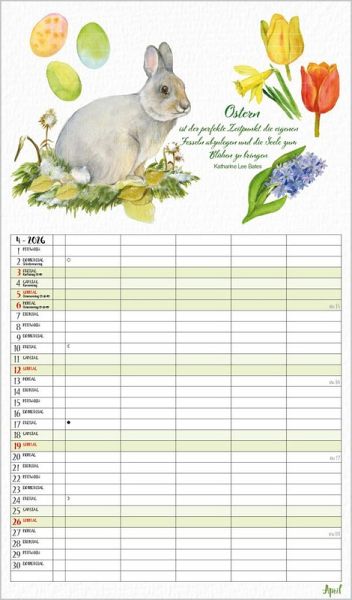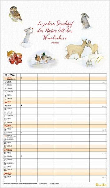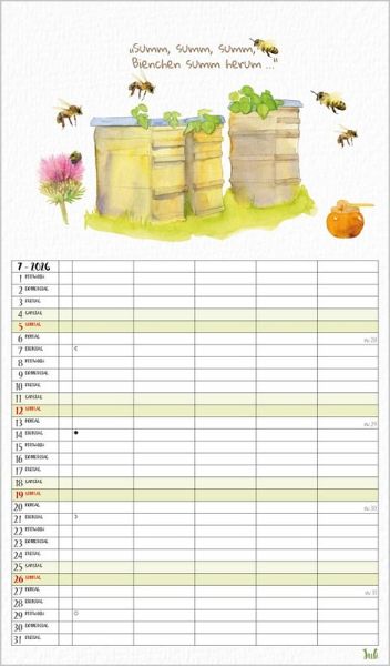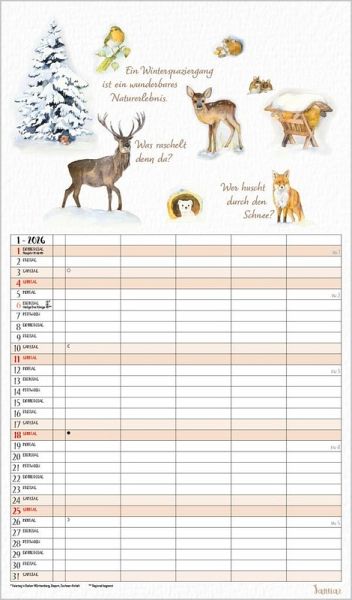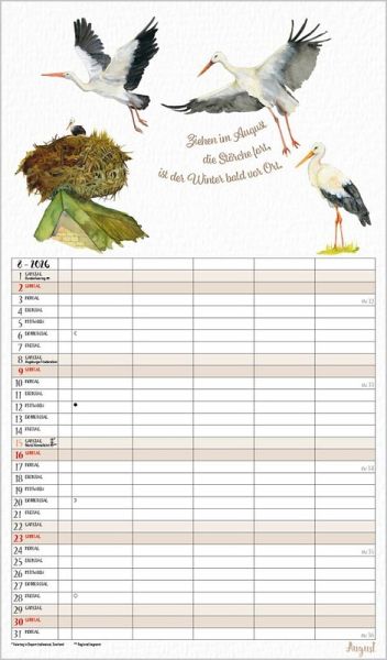 Dieser liebevoll von Petra Lefin gestaltete Kalender im Aquarellstil zeigt jeden Monat fr öhliche Motive aus der Natur mit Zitaten, Infos und Tipps. Mit 5 Spalten, extra Müllspalte sowie Ferienterminen und Vorschau bis März des Folgejahres.