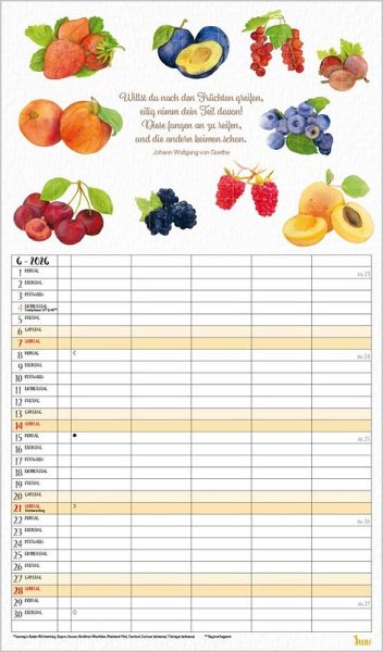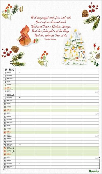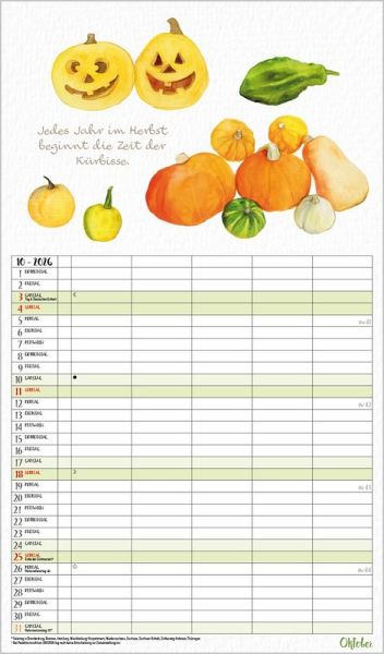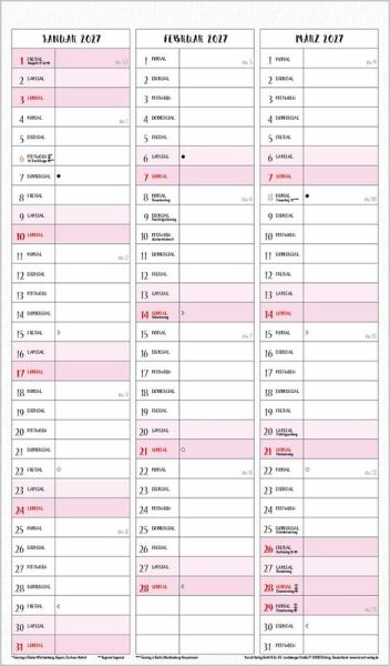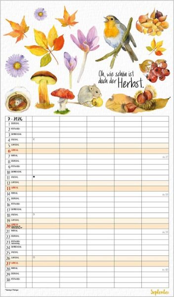 Übersichtlicher Familienplaner, 5 große Spalten; stabile Rückwand; Format: 27 x 46 cm Viel Platz für Eintragungen, ohne störende Bilder in den Spalten leichte Beschreibbarkeit, auch mit Bunt- und Bleistiften Deutsches Kalendarium mit regionalen Feiertagen für D, A und CH Farblich hervorgehobene Sonn- und Feiertage, Anzeige der Zeitumstellung Gedruckt auf dickem und umweltfreundlichem FSC Papier