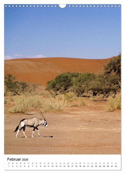 Februar: Oryx Antilope vor einer Sanddüne in der Namib Wüste