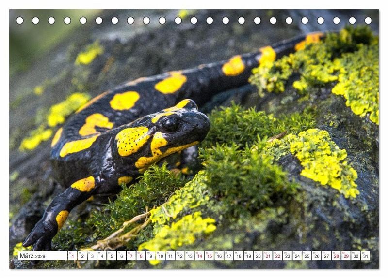 März: Der leuchtendgelb gefleckte Feuersalamander fühlt sich in feuchten Wäldern mit kühlen Quellbächen am wohlsten.