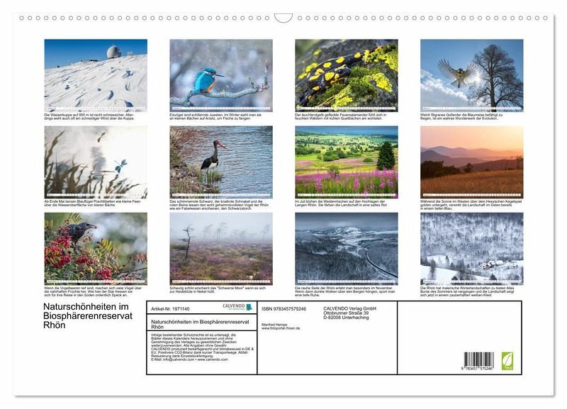 Der Kalender enthält stimmungsvolle Landschaftsfotos des UNESCO Biosphärenreservates in der Hessischen, Bayrischen und Thüringischen Rhön sowie wahre "Juwelen" der hier vorkommenden Tierarten. Besucher bekommen diese nur selten zu Gesicht. Umso mehr kann man über die Fotos staunen und sich an den Naturschönheiten erfreuen.