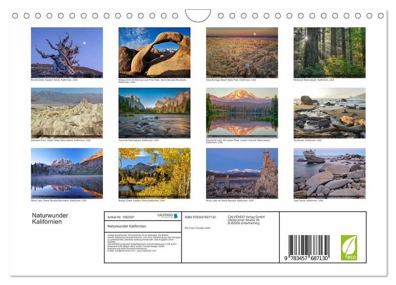 QUALITÄT - Hochwertiger Fotokalender mit 12 wunderschönen Motiven auf lichtbeständigem Bilderdruckpapier, robuste Spiralbindung mit Aufhängebügel.NACHHALTIG - deutliche Abfallreduzierung durch bedarfsgerechte Einzelstückfertigung, umweltfreundliches FSC-zertifiziertes Papier, Produktion in Deutschland, klimabewusste Logistik.PERFEKTES GESCHENK - Kalender für Freunde und Familie, für Kinder und Erwachsene, jung und alt, zu Weihnachten, Geburtstag oder zwischendurch.VIELFALT - Bildkalender in verschiedenen Formaten, z.B. DIN A5, DIN A4, DIN A3 sowie DIN A2. Ob Naturmotiv, Gemälde oder Fotos, ideal für ein persönliches Wohlfühlambiente.Kalifornien bietet eine unglaubliche Naturvielfalt, festgehalten in 13 Bildern von Christian Heeb von Autor(in): Christian Heeb