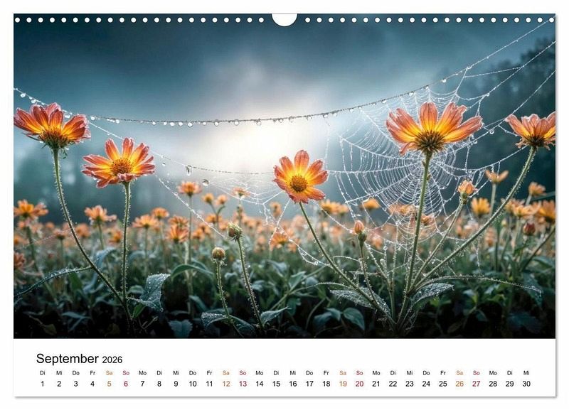 September: Spinnennetze glitzern im Morgentau - filigrane Brücken zwischen den Blumen