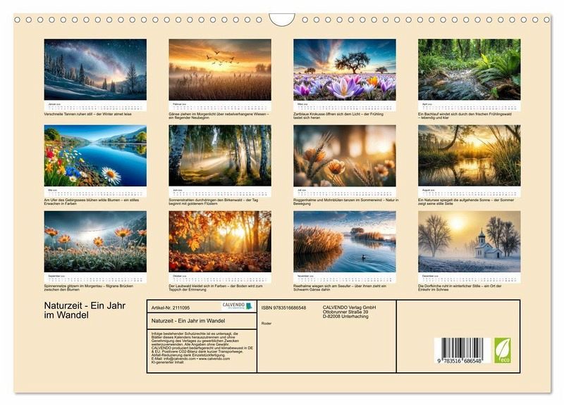 Zwölf Naturmomente laden Sie ein, die feinen Zwischentöne der Natur zu entdecken - fernab von Lärm und Eile. Jeder Monat zeigt eine Szene, die den Wandel der Jahreszeiten in ihrer stillen Schönheit einfängt: frostige Wälder, blühende Wiesen, goldene Felder und nebelverhangene Morgen. Gestaltet mit dem Auge fürs Detail sind diese Bilder eine Hommage an die Schönheit unserer Natur, wobei die grafische Umsetzung im Zusammenspiel klassischer Gestaltung und ausgewählter KI-basierter Methoden erfolgte. "Naturzeit - ein Jahr im Wandel" ist eine Einladung, innezuhalten, zu beobachten und sich berühren zu lassen. Für alle, die die Natur lieben.