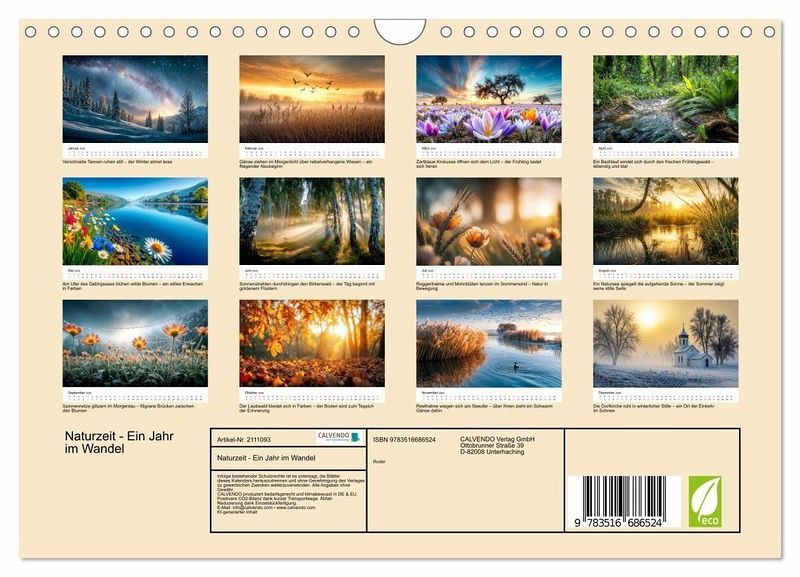 Zwölf Naturmomente laden Sie ein, die feinen Zwischentöne der Natur zu entdecken - fernab von Lärm und Eile. Jeder Monat zeigt eine Szene, die den Wandel der Jahreszeiten in ihrer stillen Schönheit einfängt: frostige Wälder, blühende Wiesen, goldene Felder und nebelverhangene Morgen. Gestaltet mit dem Auge fürs Detail sind diese Bilder eine Hommage an die Schönheit unserer Natur, wobei die grafische Umsetzung im Zusammenspiel klassischer Gestaltung und ausgewählter KI-basierter Methoden erfolgte. "Naturzeit - ein Jahr im Wandel" ist eine Einladung, innezuhalten, zu beobachten und sich berühren zu lassen. Für alle, die die Natur lieben.