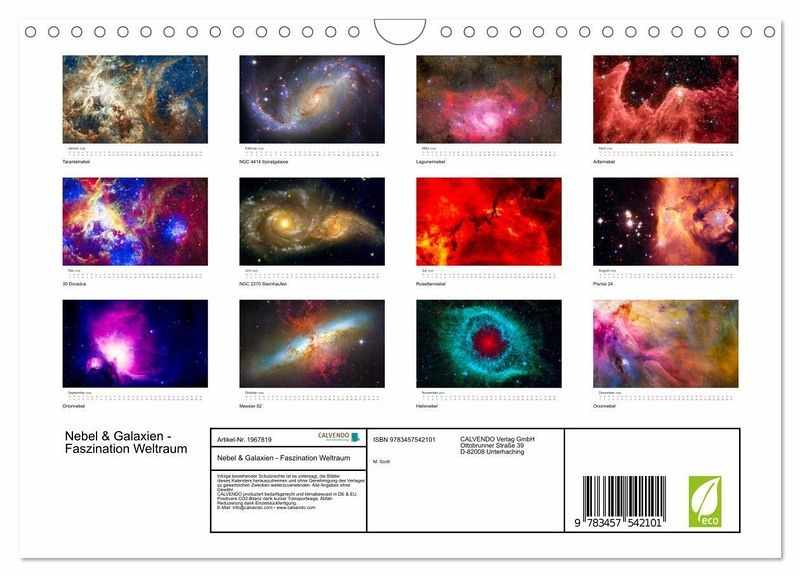 Erleben Sie die unendliche Schönheit des Weltraums mit unserem neuen Kalender Nebel & Galaxien - Faszination Weltraum! Lassen Sie sich von atemberaubenden Aufnahmen von Sternenhaufen, Spiralgalaxien und farbenprächtigen Nebeln verzaubern. Jeder Monat bietet ein neues Highlight aus dem Universum, das Sie begeistern wird. Der Kalender eignet sich perfekt als Geschenk für Weltraum-Fans oder als dekoratives Element für Ihr Zuhause oder Büro. Bestellen Sie jetzt und entdecken Sie die unendlichen Weiten des Weltraums!