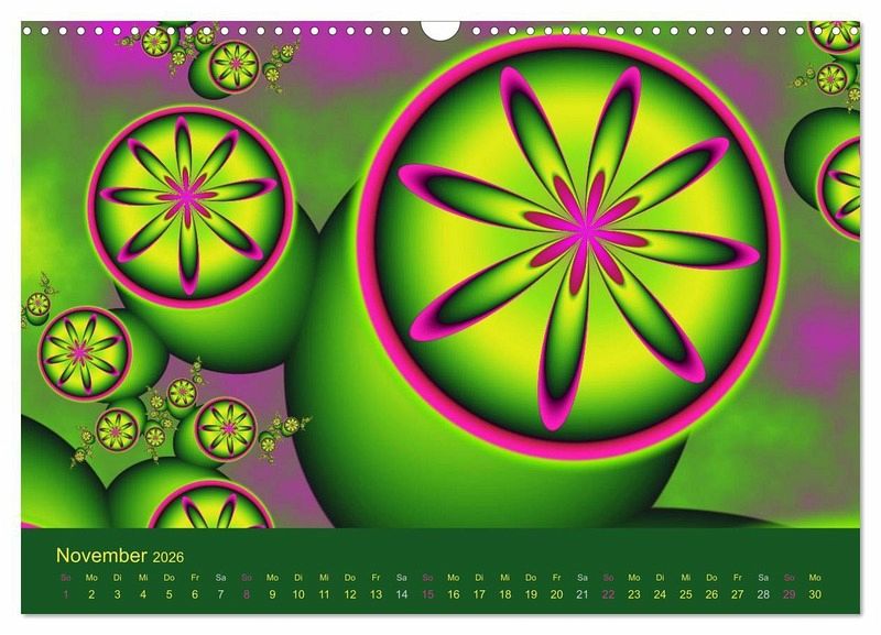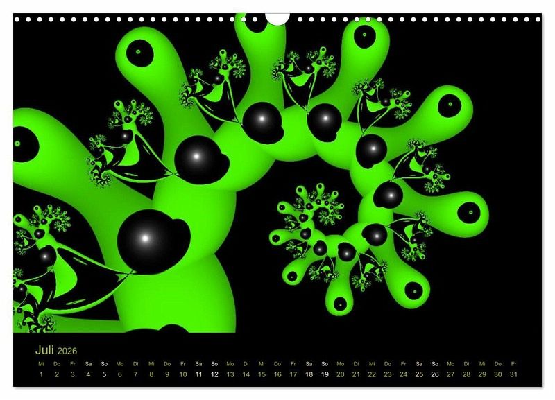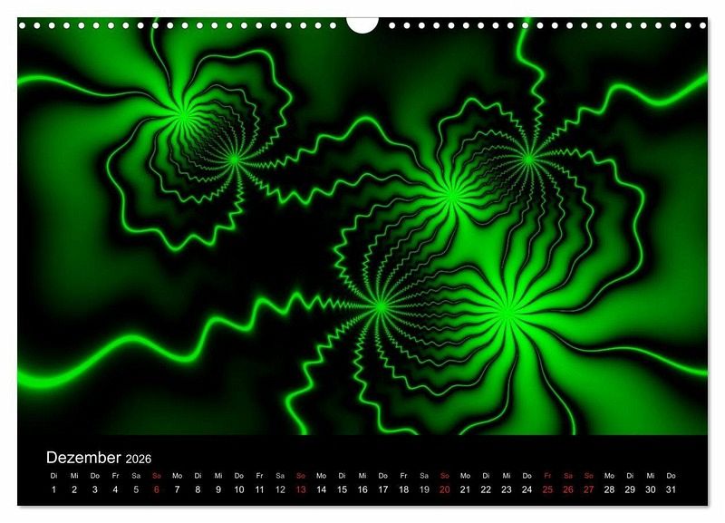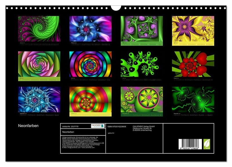 Mit moderner und farbenfroher Fraktalkunst durch das Jahr. Die Künstlerin gabiw ist in diesem Genre schon seit langer Zeit international bekannt und angesehen. Viele ihrer Bilder befinden sich als große Drucke an den Wänden ihrer Zielgruppe. Ein Kalender, der auf- und aus dem Rahmen fällt, ein außergewöhnlicher Blickfang.