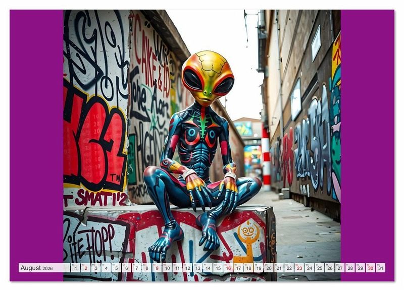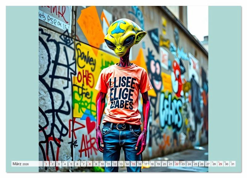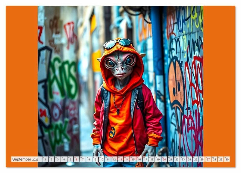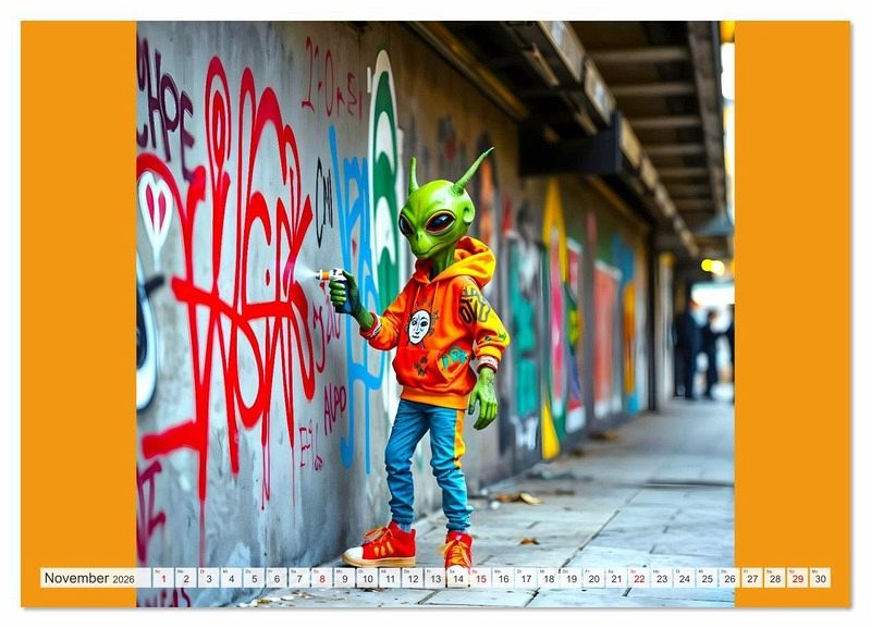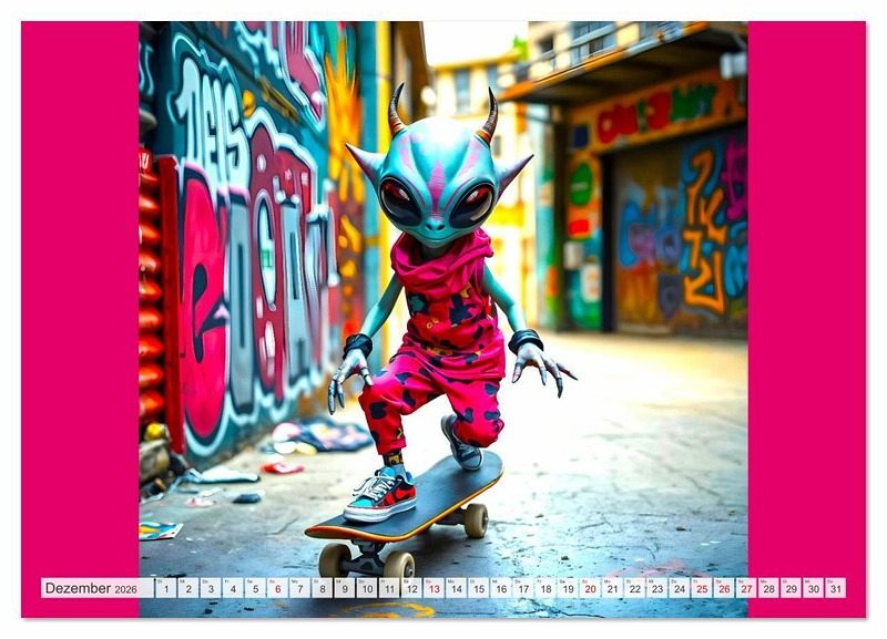Dieser außergewöhnliche KI generierte Kalender bringt dir jeden Monat ein neues, abgefahrenes Motiv: coole skatende Aliens rollen durch Betonlandschaften, posieren vor knalligen Graffiti-Wänden und bringen Farbe in jeden Monat. Eine Mischung aus Science-Fiction, Street Culture und moderner Kunst. Ein Muss für alles Fans von Street Kultur, und intergalaktischem Humor. Stylisch. Schrill. Anders. Alle gezeigten Figuren sind rein fiktiv und wurden eigenständig durch KI generiert. Ähnlichkeiten mit realen oder fiktiven Figuren sind rein zufällig.