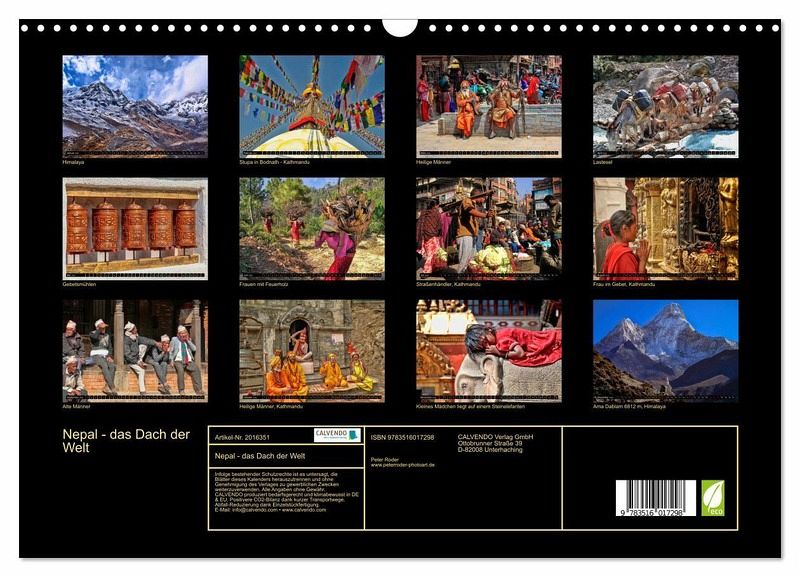 Buddhistische Klöster, hinduistische Tempel, das Heiligtum Namo Buddha, in der Annapurna-Region die beeindruckende majestätische Schönheit der Achttausender, im Terai-Tiefland der Chitwan-Nationalpark - Nepal fasziniert nicht nur mit seiner überragenden Bergwelt, sondern hat auch viele weitere einmalige Naturerlebnisse zu bieten. Aber Nepal ist auch stark gefährdet und wird inzwischen schon das "eingestürzte Dach der Welt" genannt, seit am 25. April 2015 die Erde 80 km von der Millionenstadt Kathmandu entfernt bebte. Viele Gebäude und Tempel stürzten ein, mehr als 7.000 Menschen starben, mehr als 20.000 wurden verletzt und mehr als 10.000 Nepalesen wurden obdachlos. Inzwischen ist Nepal wieder ein sicheres Reiseziel und jeder hofft, dass die Touristen, die früher in Scharen ins Land eingefallen sind, bald wiederkommen, damit es wieder aufwärts geht mit Nepal, dem "Dach der Welt". Eindrucksvolle Bilder aus dem "heilen" Nepal hat der Fotokünstler Peter Roder für diesen Kalender ausgewählt und gestaltet, ein beeindruckender Begleiter für das ganze Jahr.