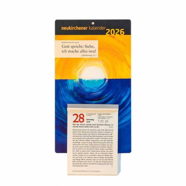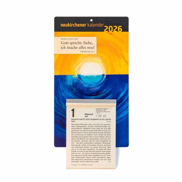 Der Neukirchener Kalender ist für viele Bibelleserinnen und -leser ein unverzichtbarer Impuls für den Tag! Über 200 Mitarbeitende aus fünf Ländern und verschiedenen christlichen Kirchen sorgen dafür, dass dieser traditionsreiche Andachts- und Bibellesekalender für einen offenen und lebensnahen Glauben steht. Besonders machen ihn seine beiden täglichen Texte: Im ersten wird der Bibeltext des Ökumenischen Bibelleseplans erschlossen und im zweiten mit einer alltagsnahen Erzählung, einem Impuls oder einem Gebet veranschaulicht. Ergänzt werden die Texte mit Liedvorschlägen, Jahrestagen besonderer Persönlichkeiten, den beliebten Buchtipps, und den Monatssprüchen.Diese Ausgabe ist das Original: Seit mehr als 135 Jahren ist der Abreißkalender beliebt und bewährt und hat bei vielen einen festen Platz - in der Wohnung und im Herzen. Besonders schön macht ihn die große Rückwand mit der Jahreslosung. Der Neukirchener Kalender folgt dem Standard-Bibelleseplan der Ökumenischen Arbeitsgemeinschaft für Bibellesen.