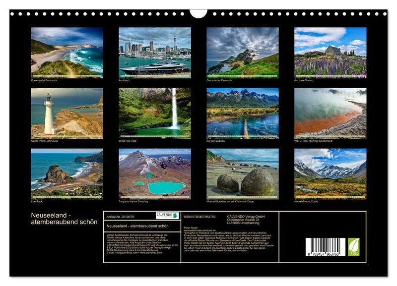 "Erwache im Paradies. Die spektakulären Landschaften und freundlichen Einwohner Neuseelands sind näher, als du denkst. Wache in einem Land auf, in dem dich jeden Tag neue Abenteuer erwarten." Mit diesen Sätzen begrüßt die offizielle Reise-Website von Neuseeland ihre Gäste. Für diesen Kalender hat der Fotokünstler Peter Roder zwölf beeindruckende Aufnahmen aus dem wunderschönen Neuseeland zusammengestellt und gestaltet, eine Freude für jeden Freund dieses imposanten Landes, ein Begleiter für das ganze Jahr oder ein wertvolles Geschenk für die, die wir lieben.