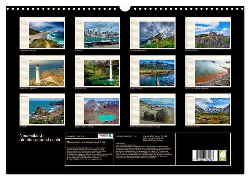 "Erwache im Paradies. Die spektakulären Landschaften und freundlichen Einwohner Neuseelands sind näher, als du denkst. Wache in einem Land auf, in dem dich jeden Tag neue Abenteuer erwarten." Mit diesen Sätzen begrüßt die offizielle Reise-Website von Neuseeland ihre Gäste. Für diesen Kalender hat der Fotokünstler Peter Roder zwölf beeindruckende Aufnahmen aus dem wunderschönen Neuseeland zusammengestellt und gestaltet, eine Freude für jeden Freund dieses imposanten Landes, ein Begleiter für das ganze Jahr oder ein wertvolles Geschenk für die, die wir lieben.