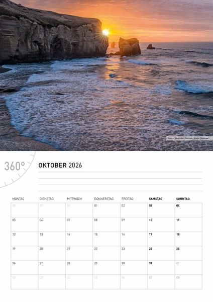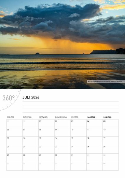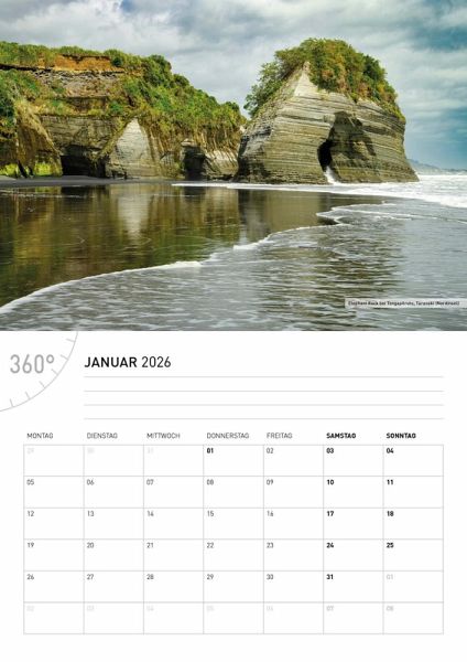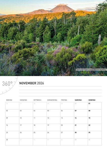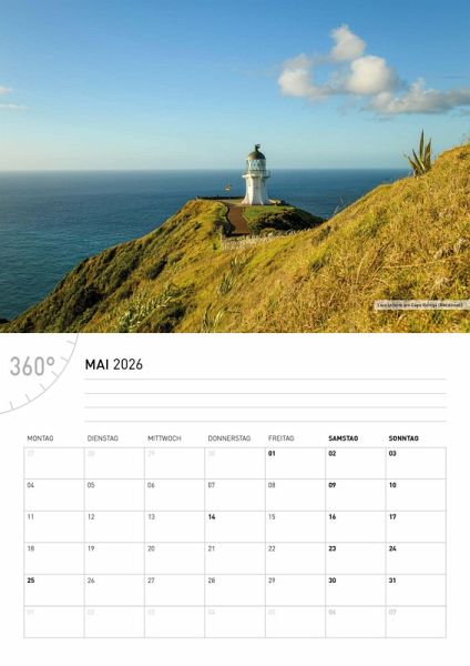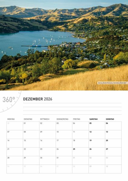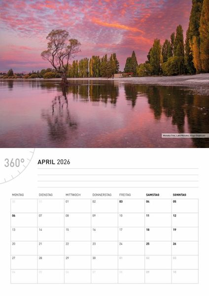 Der Neuseeland Broschürenkalender 2026 erscheint im kompakten A4 Format (29,7 x 21 cm). Auf hochwertigem Papier präsentiert er traumhafte Bilder. Aufgeklappt auf A3 Format (29,7 x 42 cm) bietet er im Kalendarium Platz für Termine und Notizen.