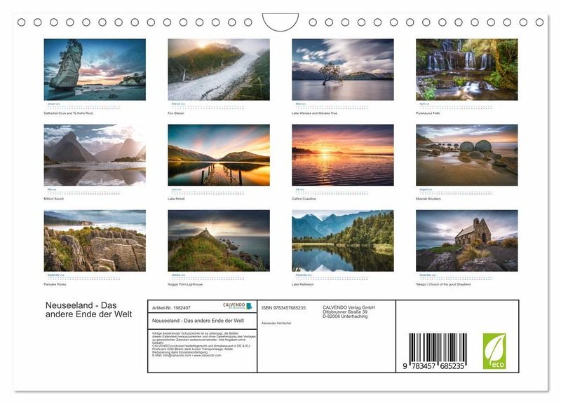 QUALITÄT - Hochwertiger Fotokalender mit 12 wunderschönen Motiven auf lichtbeständigem Bilderdruckpapier, robuste Spiralbindung mit Aufhängebügel.NACHHALTIG - deutliche Abfallreduzierung durch bedarfsgerechte Einzelstückfertigung, umweltfreundliches FSC-zertifiziertes Papier, Produktion in Deutschland, klimabewusste Logistik.PERFEKTES GESCHENK - Kalender für Freunde und Familie, für Kinder und Erwachsene, jung und alt, zu Weihnachten, Geburtstag oder zwischendurch.VIELFALT - Bildkalender in verschiedenen Formaten, z.B. DIN A5, DIN A4, DIN A3 sowie DIN A2. Ob Naturmotiv, Gemälde oder Fotos, ideal für ein persönliches Wohlfühlambiente.Eine fotografische Expedition durch Neuseeland von Autor(in): Alexander Höntschel