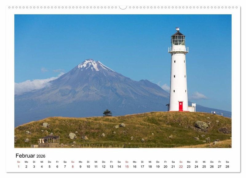 Februar: Cape Egmont Lighthouse mit Mount Taranaki, Pungarehu