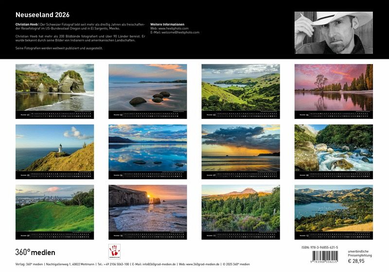 Aus traumhaften Neuseeland-Aufnahmen des Fotografen Christian Heeb hat die Redaktion von 360° medien die 13 schönsten Motive ausgewählt und in diesem Kalender zusammen gestellt. Präsentiert werden die Fotos auf hochwertigem Papier im Format 50 cm x 35 cm.