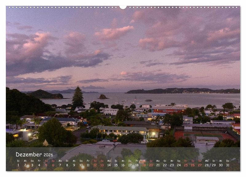 Dezember: Abendstimmung mit Blick auf den Ort und HAfen von Paihia im Norden Neuseelands