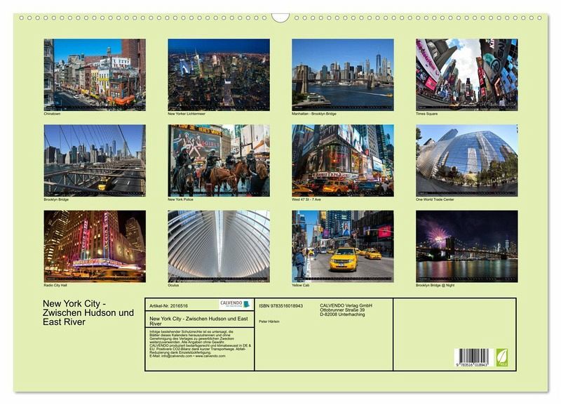 Willkommen in New York, der vielleicht faszinierendsten Metropole der Welt. Es gibt wohl nichts, was "The Big Apple", wie die Amerikaner ihr New York nennen, nicht zu bieten hätte. Die Stadt ist imposant, faszinierend, multikulturell und vor allem betriebsam - nicht umsonst bezeichnet man New York auch als "the city that never sleeps", also die Stadt, die niemals schläft. Sie ist Anziehungspunkt für Besucher aus aller Welt. Gewinnen Sie mit den zwölf Kalenderseiten einen Über- und Einblick in die pulsierende Metropole.