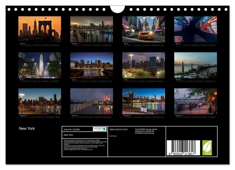 New York, die Stadt, die niemals schläft. Aufregend, beeindruckend, lebendig und voller Schönheit, so hat der Fotograf Kurt Krause die Metropole New York in diesem Kalender festgehalten. 12 wunderbare Aufnahmen im abendlichen Lichtermeer fotografiert werden Ihnen Monat für Monat Ihre Wand im Wohnzimmer, im Schlafzimmer oder im Büro schmücken.