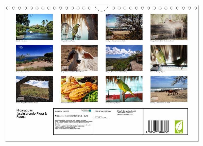 Dieser hochwertige Fotokalender ist eine Liebeserklärung an Nicaragua und seine einzigartig schöne Flora und Fauna: Beeindruckende Vulkanlandschaften, unberührte Urwälder, herrliche weiße Sandstrände, riesige glückliche Rinderherden und eine bunte Artenvielfalt in der Vogelwelt.
