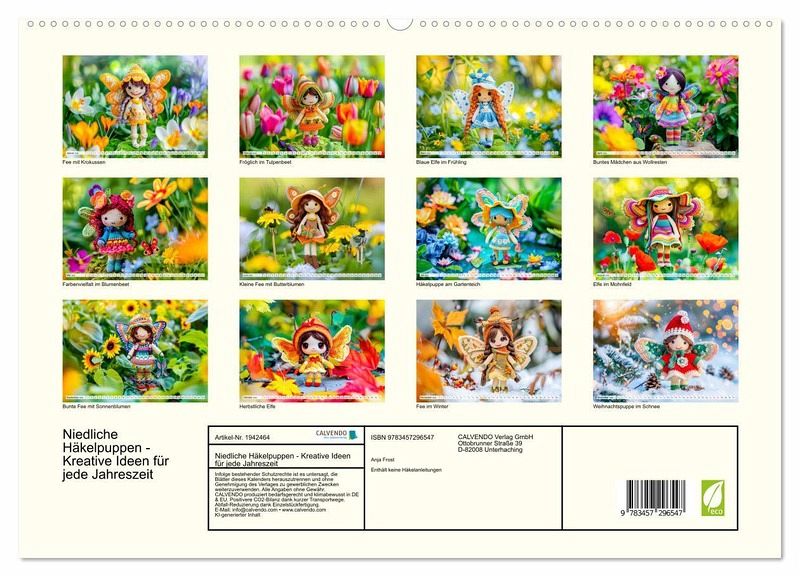 Der Kalender "Niedliche Häkelpuppen - Kreative Ideen für jede Jahreszeit" zeigt zauberhafte KI-generierte Häkelpuppen mit Flügeln, die harmonisch in die jeweilige Jahreszeit eingebettet sind. Umgeben von passenden Blumen und liebevollen Details, entstehen stimmungsvolle Szenen, die zum Träumen einladen. Eine wunderbare Inspiration für alle, die handgefertigte Kunst lieben. Bitte beachten: Es handelt sich um künstlerische Darstellungen und enthält keine Häkelanleitungen.