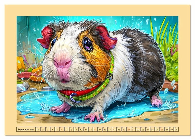 Diese lustigen Illustrationen zeigen entzückende Meerschweinchen mit Hut, Halsband oder Weihnachtsmütze. Ob an Ostern, im Sommerregen oder beim Halloween-Snack - jeden Monat erwartet dich ein neues schmunzelndes Highlight. Alle Illustrationen wurden mithilfe von KI erstellt und bringen charmanten Tierhumor in deinen Alltag. Perfekt für Tierfreunde und alle Menschen die Meerschweinchen toll finden.