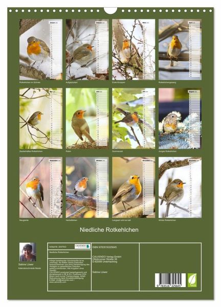 Wer liebt sie nicht, die flinken kleinen Rotkehlchen, die aufgeplustert so niedlich kugelig aussehen? Die Autorin hat sie zu jeder Jahreszeit abgelichtet, so können Sie sich jeden Monat auf ein zauberhaftes Foto freuen und zusätzlich können Sie die Geburtstage Ihrer Lieben eintragen.