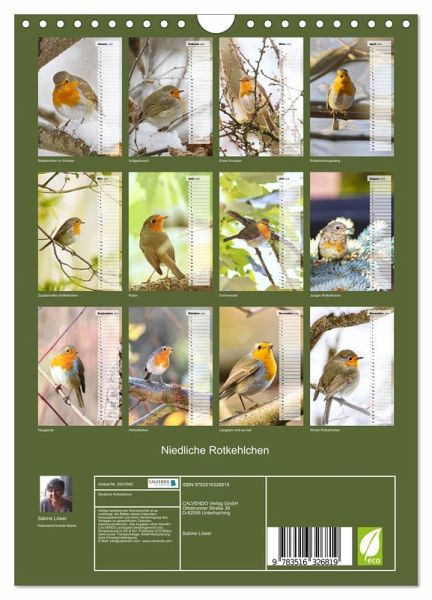 Wer liebt sie nicht, die flinken kleinen Rotkehlchen, die aufgeplustert so niedlich kugelig aussehen? Die Autorin hat sie zu jeder Jahreszeit abgelichtet, so können Sie sich jeden Monat auf ein zauberhaftes Foto freuen und zusätzlich können Sie die Geburtstage Ihrer Lieben eintragen.