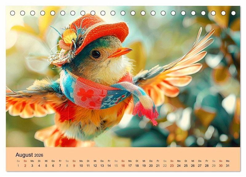 Erleben Sie eine Welt voll flatternder Eleganz und charmantem Gefieder! Dieser Kalender wurde mit Hilfe von KI erstellt und präsentiert zwölf Monate mit duftiger Vogelmode. Lassen Sie sich von den farbenfrohen Designs und dem lieblichen Charme der zauberhaften Models bezirzen, während sie die modische Welt der gefiederten Stars genießen.