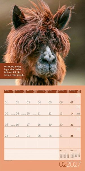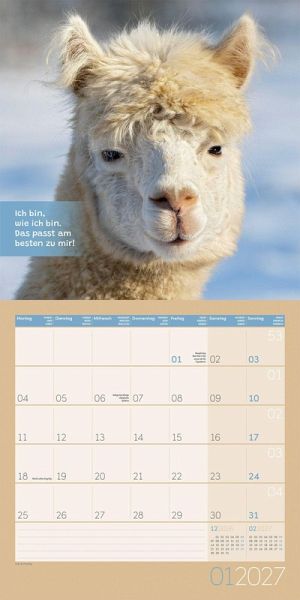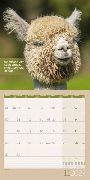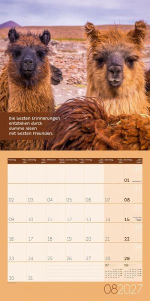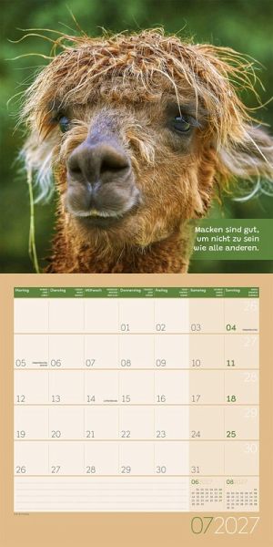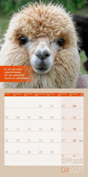 Die Mimik von Lamas ist einfach einzigartig komisch. Grund dafür ist ihre gespaltene Oberlippe, die so beweglich ist, dass dadurch die lustigsten Gesichtsausdrücke entstehen. Zu den ausdrucksstarken Bildern in diesem Kalender passen coole Sprüche, die mit Humor durchs Jahr führen und für jede Menge gute Laune sorgen. Alle Art12-Kalender sind mit einem Jahresplaner ausgestattet.