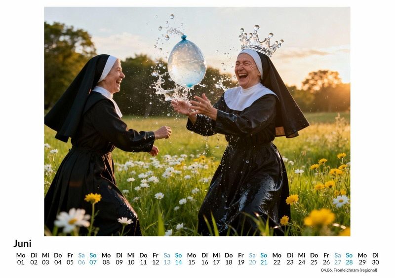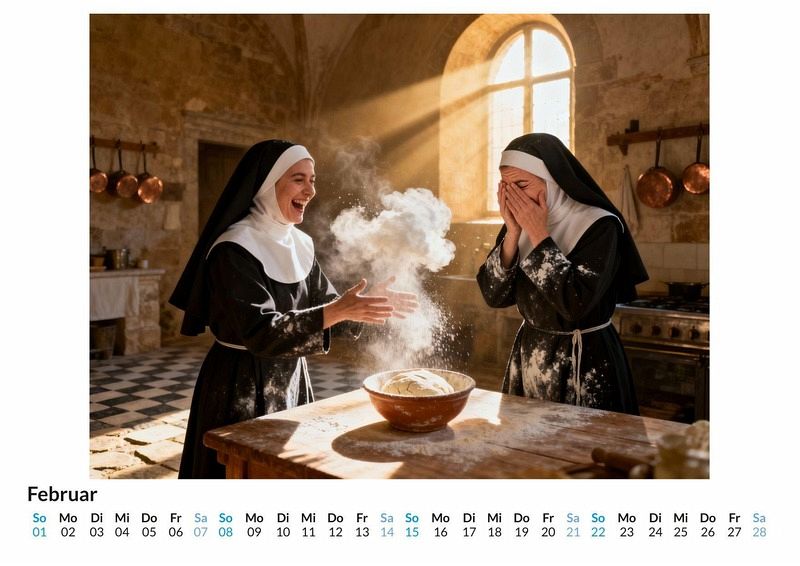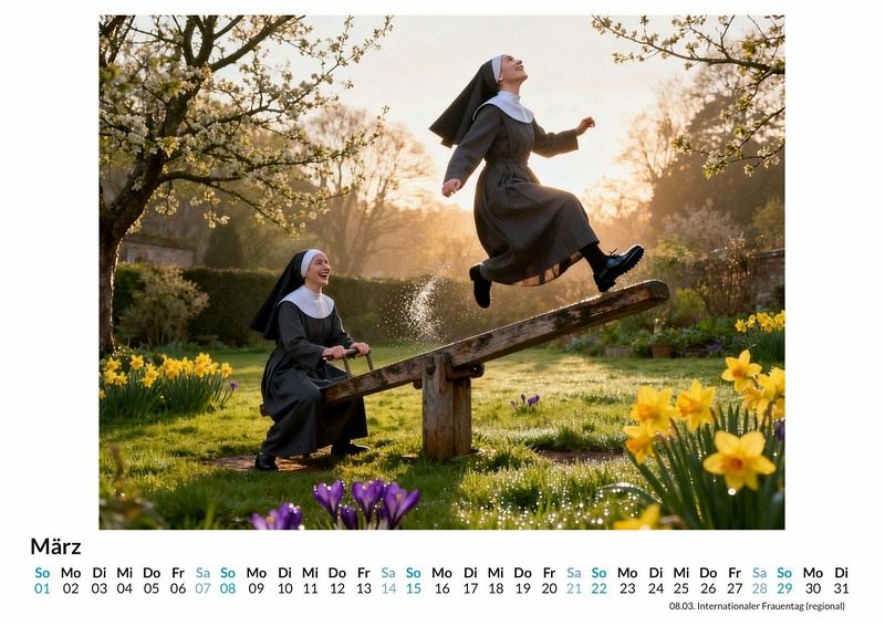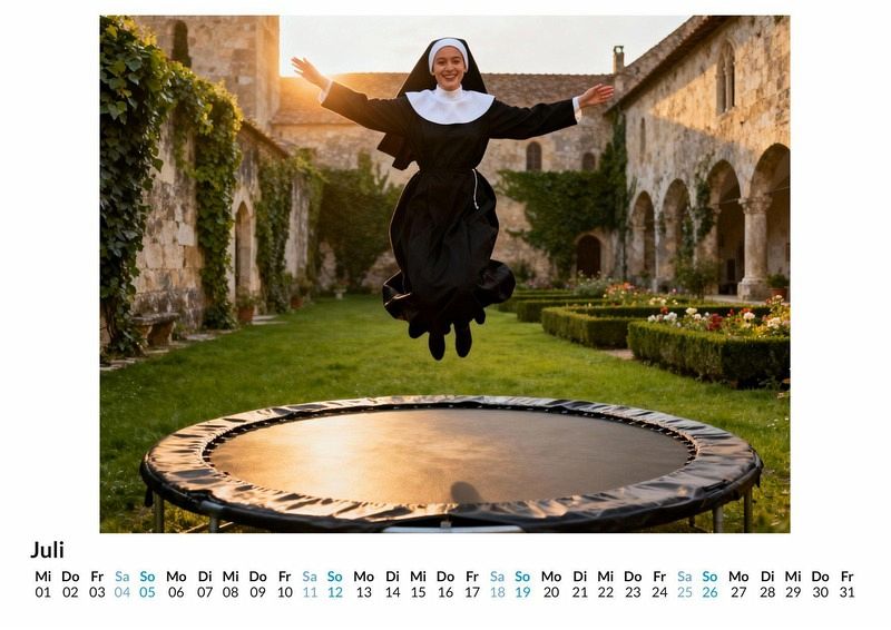 Wer sagt, dass ein Leben in Frömmigkeit nicht auch voller Lachen und Abenteuer sein kann? Der Kalender "Nonnen, die Spaß haben" bricht mit Konventionen und zeigt eine Welt, in der das Spirituelle auf das Spielerische trifft. Dieser Kalender ist eine gute Wahl: * Für Menschen mit Sinn für Humor und das Unerwartete. * Als originelles Geschenk, das für Gesprächsstoff sorgt. * Für Liebhaber von Motiven, die traditionelle Bilder auf den Kopf stellen. Jeder Monat enthüllt eine neue, überraschende Szene. Frauen in klassischer Ordenstracht werden beim Skateboarden in einer Halfpipe, konzentriert vor einer Spielekonsole oder lachend auf einem Trampolin gezeigt. Die Szenen entspringen einer digitalen Fantasie, die unzählige visuelle Informationen zu neuen, nie gesehenen Kompositionen verwebt hat. Das Ergebnis sind zwölf Momentaufnahmen, die das Alltägliche mit dem Außergewöhnlichen verbinden und die Frage stellen, wo die Grenzen der Vorstellungskraft liegen. Der Kauf dieses Kalenders beinhaltet: * Zwölf Monatsmotive im praktischen Wandkalenderformat. * Einzigartige Bilder, die zum Schmunzeln und Nachdenken anregen. * Ein übersichtliches Kalendarium für Termine und Notizen. Dieser Kalender ist eine Hommage an die Lebensfreude an den unerwartetsten Orten. Er beweist, dass Glaube und Spaß Hand in Hand gehen können. Ein Blick auf die einzelnen Monatsmotive offenbart die ganze Bandbreite dieser fröhlichen Szenen.