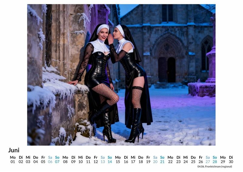 Was geschieht, wenn heilige Gelübde auf irdische Versuchungen treffen? Dieser Kalender wagt einen Blick hinter die Klostermauern und interpretiert das Bild der Nonne auf eine Weise, die bewusst provoziert und fesselt. Er bricht mit traditionellen Vorstellungen und erkundet die sündige Seite der Frömmigkeit. Dieser Kalender ist optimal geeignet: Für Liebhaber provokanter Fotokunst. Für Sammler von Motiven, die mit Konventionen brechen. Für alle, die ein unkonventionelles und gewagtes Geschenk suchen. Der Kalender "Nonnen" präsentiert eine Serie von zwölf Aufnahmen, die das Spannungsfeld zwischen Askese und Begierde ausloten. In sorgfältig arrangierten Szenen werden Frauen in aufreizend modifizierter Ordenskleidung gezeigt. Das Spiel mit Licht und Schatten unterstreicht die sündige Atmosphäre, die jedes einzelne Bild umgibt. Jedes Motiv wurde durch die schöpferische Kraft fortschrittlicher Algorithmen zum Leben erweckt und stellt eine moderne Vision verbotener Fantasien dar. Beim Kauf dieses Kalenders kann man Folgendes erwarten: Zwölf Monatsmotive und ein Deckblatt. Ein Wandkalender im praktischen DIN A3 Format. Fotorealistische Darstellungen, die das Thema Sünde und Verlangen interpretieren. Dieser Kalender ist mehr als nur ein Zeitmesser. Er ist eine Einladung, die Grenzen zwischen Frömmigkeit und Verführung zu erkunden. Ein Jahresbegleiter, der zum Betrachten anregt und gewohnte Vorstellungen infrage stellt.