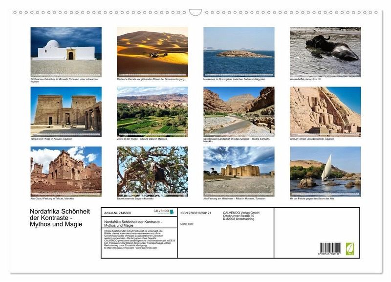 Erleben Sie die Faszination Nordafrikas in zwölf eindrucksvollen Motiven. Lassen Sie sich entführen zu geheimnisvollen Tempeln, weiten Dünenlandschaften, grünen Oasen und beeindruckenden Küstengebieten. Entdecken Sie eine Region voller Geschichte, Kultur und natürlicher Schönheit. Jeder Monat zeigt neue Facetten - von antiken Ruinen über farbenfrohe Städte bis hin zu einzigartigen Tierwelten. Perfekt als Geschenk oder für Ihr Zuhause, um das ganze Jahr über die Magie und die Kontraste Nordafrikas zu genießen.