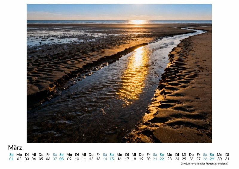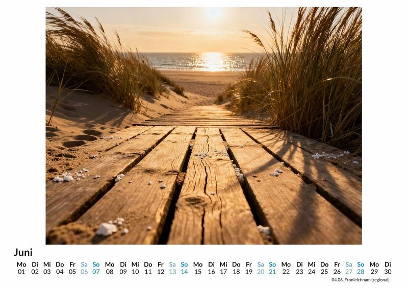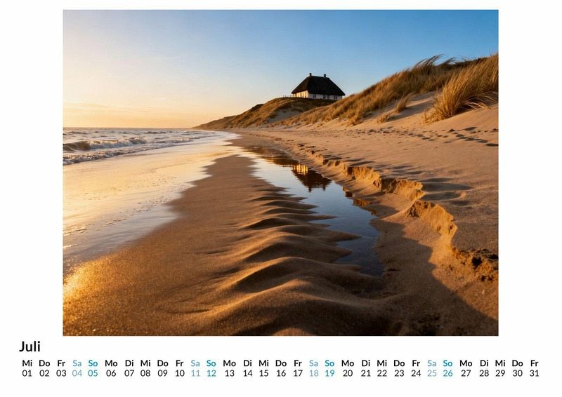 Eine frische Brise, der Ruf der Möwen und der weite Blick über das Wattenmeer. Der Kalender "Norddeutsche Küstenlandschaften" fängt die unverwechselbare Stimmung der deutschen Küste ein und bringt sie Monat für Monat nach Hause. Er ist eine visuelle Reise an die See, die das ganze Jahr über andauert. Dieser Kalender ist besonders geeignet: * Für alle, die die raue Schönheit der Nordseeküste schätzen. * Für Menschen, die sich nach der Weite des Meeres und der Ruhe der Dünen sehnen. * Für Liebhaber der charakteristischen Küstenarchitektur mit ihren Reetdächern und Backsteinfassaden. Zwölf Motive führen durch das Jahr. Sie zeigen sonnenbeschienene Strände, dramatische Wolkenformationen über der aufgewühlten See und idyllische Dörfer mit ihren typischen Leuchttürmen. Jede Szene wurde aus einer unendlichen Menge an visuellen Daten digital komponiert, um eine ideale Küstenatmosphäre zu erschaffen. Die Bilder spiegeln die verschiedenen Jahreszeiten wider, von klaren Wintertagen bis zu warmen Sommerabenden am Strand. Mit dem Kauf dieses Kalenders kann man Folgendes erwarten: * Zwölf sorgfältig ausgewählte Küstenmotive für jeden Monat des Jahres. * Ein übersichtliches Kalendarium, das Platz für eigene Notizen bietet. * Eine Reise durch die vielfältigen Landschaften der deutschen Nordseeküste. Dieser Kalender ist eine Hommage an die norddeutsche Küste und ihre einzigartige Ausstrahlung. Er begleitet durch das Jahr mit Bildern, die Fernweh wecken und gleichzeitig ein Gefühl von Heimat vermitteln. Es lohnt sich, einen Blick auf die einzelnen Monatsblätter zu werfen.