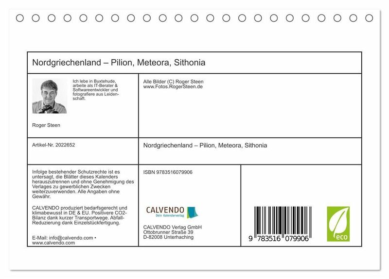 Dieser Kalender nimmt Sie mit auf eine Reise durch die Vielfältigkeit des nördlichen Griechenlands: Die Farbenpracht des Pilion, die einsamen Strände auf Sithonia und der Berg Athos, die Klöster in Meteora und auch das eine oder andere Fischerboot gehört zu Griechenland.