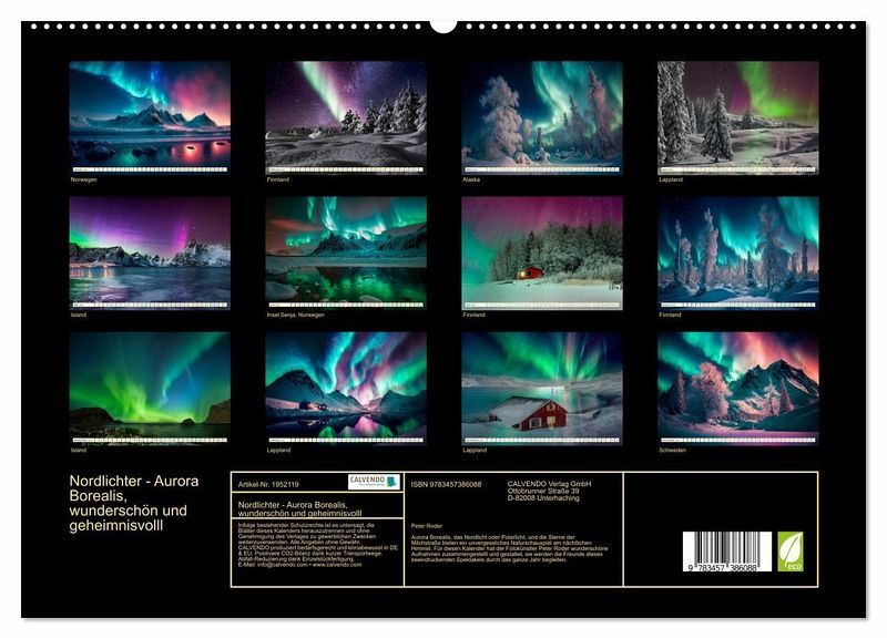 Aurora Borealis, das Nordlicht oder Polarlicht, und die Sterne der Milchstraße bieten ein unvergessliches Naturschauspiel am nächtlichen Himmel. Für diesen Kalender hat der Fotokünstler Peter Roder wunderschöne Aufnahmen zusammengestellt und gestaltet, sie werden die Freunde dieses beeindruckenden Spektakels durch das ganze Jahr begleiten.