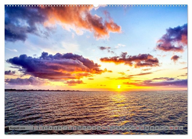 Faszinierende Lichtstimmungen am Meer, leuchtend bunte Wolken, stimmungsvolle Sonnenuntergänge, einfach nur traumhaft. Ein must have für jeden Nordsee-Fan. 12 verschiedene bezaubernde Sonnenuntergangsstimmungen schmücken Monat für Monat Ihre Wände. Holen Sie sich diesen tollen Kalender für sich oder als Geschenk für Ihre Liebsten.