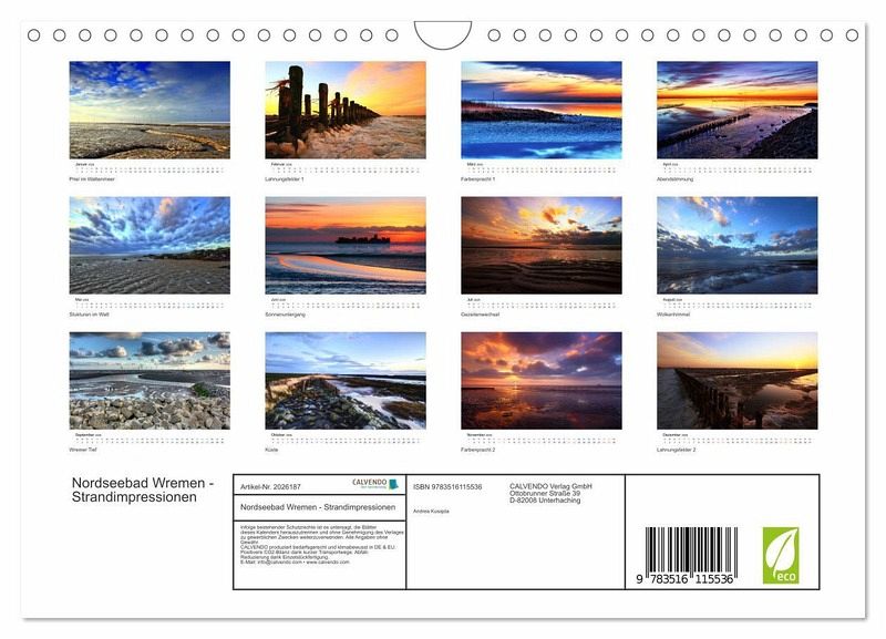 QUALITÄT - Hochwertiger Fotokalender mit 12 wunderschönen Motiven auf lichtbeständigem Bilderdruckpapier, robuste Spiralbindung mit Aufhängebügel.NACHHALTIG - deutliche Abfallreduzierung durch bedarfsgerechte Einzelstückfertigung, umweltfreundliches FSC-zertifiziertes Papier, Produktion in Deutschland, klimabewusste Logistik.PERFEKTES GESCHENK - Kalender für Freunde und Familie, für Kinder und Erwachsene, jung und alt, zu Weihnachten, Geburtstag oder zwischendurch.VIELFALT - Bildkalender in verschiedenen Formaten, z.B. DIN A5, DIN A4, DIN A3 sowie DIN A2. Ob Naturmotiv, Gemälde oder Fotos, ideal für ein persönliches Wohlfühlambiente.Einzigartige Eindrücke und Stimmungen vom Wremer Strand von Autor(in): Andrea Kusajda