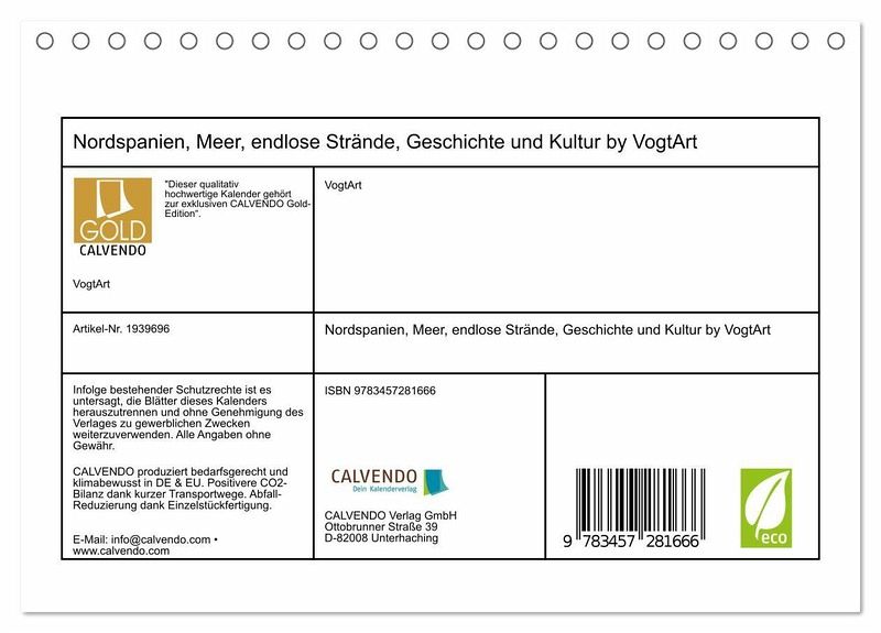 Erleben Sie die Schönheit Nordspaniens in Ihrem Zuhause mit unserem Fotokalender. Tauchen Sie ein in die Geschichte und Kultur dieser Region und lassen Sie sich von den endlosen Stränden und dem Meer verzaubern. Jeden Monat können Sie eine neue Seite mit atemberaubenden Bildern entdecken, die Sie in die wunderschöne Landschaft Nordspaniens entführen. Bestellen Sie jetzt und holen Sie sich ein Stück Nordspanien in Ihr Zuhause!" "Dieser qualitativ hochwertige Kalender gehört zur exklusiven CALVENDO Gold-Edition".