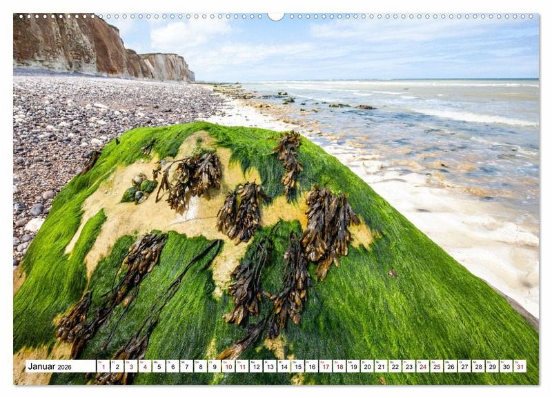 Januar: Kreidefelsen von Seetang bedeckt