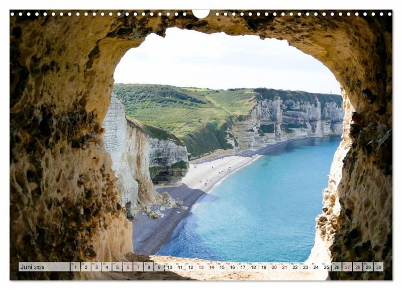 Juni: Blick durch ein Felsenloch in der Pointe de la Courtine auf den Strand von Tilleul