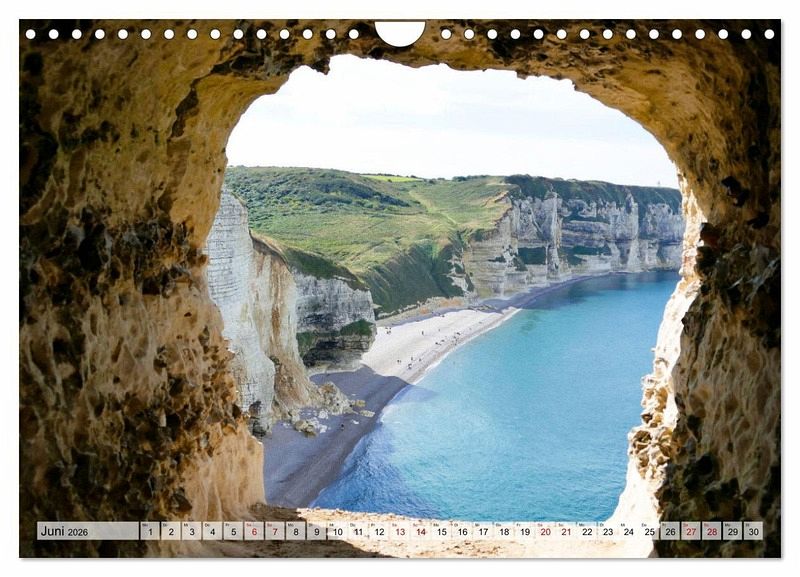 Juni: Blick durch ein Felsenloch in der Pointe de la Courtine auf den Strand von Tilleul