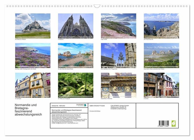 QUALITÄT - Hochwertiger Fotokalender mit 12 wunderschönen Motiven auf lichtbeständigem Bilderdruckpapier, robuste Spiralbindung mit Aufhängebügel.NACHHALTIG - deutliche Abfallreduzierung durch bedarfsgerechte Einzelstückfertigung, umweltfreundliches FSC-zertifiziertes Papier, Produktion in Deutschland, klimabewusste Logistik.PERFEKTES GESCHENK - Kalender für Freunde und Familie, für Kinder und Erwachsene, jung und alt, zu Weihnachten, Geburtstag oder zwischendurch.VIELFALT - Bildkalender in verschiedenen Formaten, z.B. DIN A5, DIN A4, DIN A3 sowie DIN A2. Ob Naturmotiv, Gemälde oder Fotos, ideal für ein persönliches Wohlfühlambiente.Abwechslungsreichtum der Normandie und Bretagne in Szene gesetzt. von Autor(in): Christine Brendle-Behnisch Müller