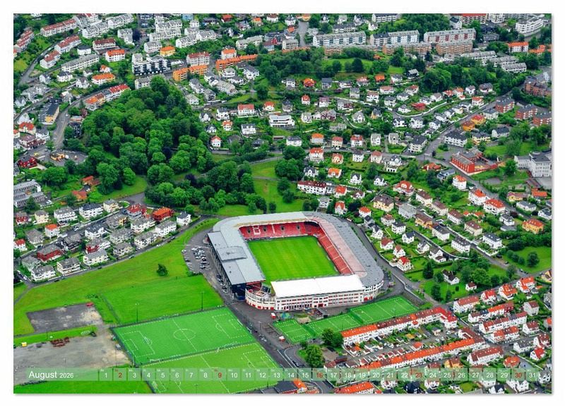 August: Norwegische Stadt Bergen und das Brann-Stadion, eingebettet in eine grüne Landschaft