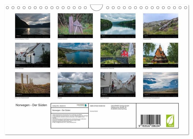 Lassen Sie sich verzaubern, von wunderschönen Landschaftsaufnahmen und wunderbaren Naturschauspielen. In diesem Kalender finden Sie eindrucksvolle Aufnahmen aus dem wunderschönen Süden Norwegens. Er enthält unter anderem faszinierende Fotografien von der schönen Stadt Stavanger, der Heidelandschaft in der Küstenregion, dem Gletscher Hardangerjøkulen und dem Wasserfall Steindalsfossen. Ob bedrohlich bewölkt, schön sonnig oder Sonnenuntergänge - es ist für jeden etwas dabei.