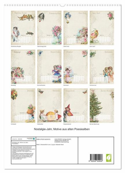Glanzbilder, Scraps oder Vielliebchen - so heißen die liebevoll gestalteten Motive in alten Poesiealben, die Kinderherzen höher schlagen lassen und Erwachsene in die heile Welt einer besseren Vergangenheit entführen - nostalgisch, fröhlich, bunt und lebensfroh! Die Bilder wecken heitere Erinnerungen und regen spielerisch die Phantasie an. Der "Nostalgie Jahr" - Kalender präsentiert großformatig 12 spielerisch romantische Collagen jahreszeitlicher Motive im vintage shabby chic Look mit einem Bereich für eigene Notizen oder Sprüche. Lassen Sie sich verzaubern vom Charme der guten alten Zeit. Eine besondere Geschenkidee für Eltern, Großeltern, Onkel und Tanten, verliebte Männer romantischer Frauen und Menschen mit Sinn für Nostalgie und Romantik. Oder schenken Sie ihn sich doch einfach selbst!