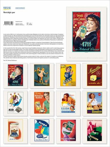 Nostalgie und eine Prise Retro-Charme zaubert dieser großformatige Kalender an die Wand. Die historischen Plakate zeigen Werbung von bekannten Marken und zum Teil in Vergessenheit geratenen Produkten in hervorragender Qualität. Bis heute haben die farbenfrohen Werbemittel nichts von ihrem Reiz eingebüßt.